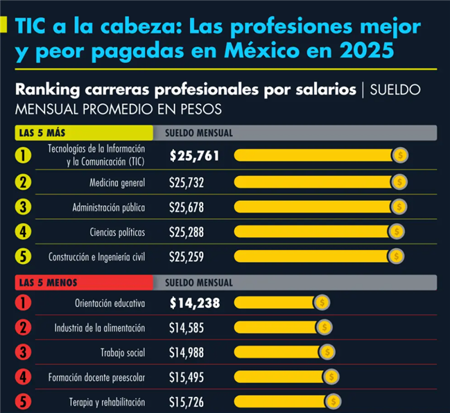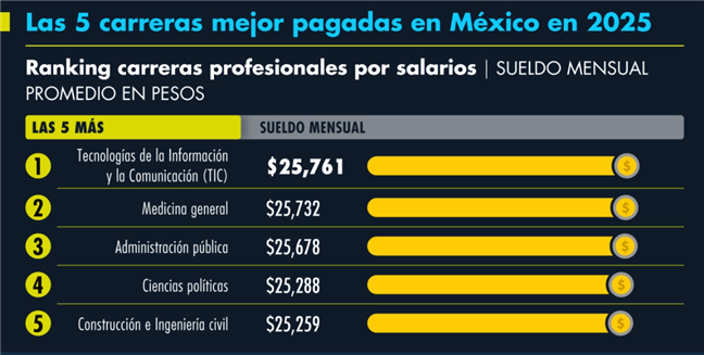 Con base en la actualización de la plataforma, estas son las 10 carreras mejor pagadas en México en 2025 y su salario promedio: