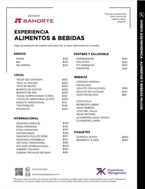 Los reportes preliminares sobre la oferta gastronómica dentro del inmueble reflejan un incremento notable en los precios de productos básicos de estadio. La estructura de costos se divide principalmente en consumo de grada y servicios especializados para zonas de palcos.