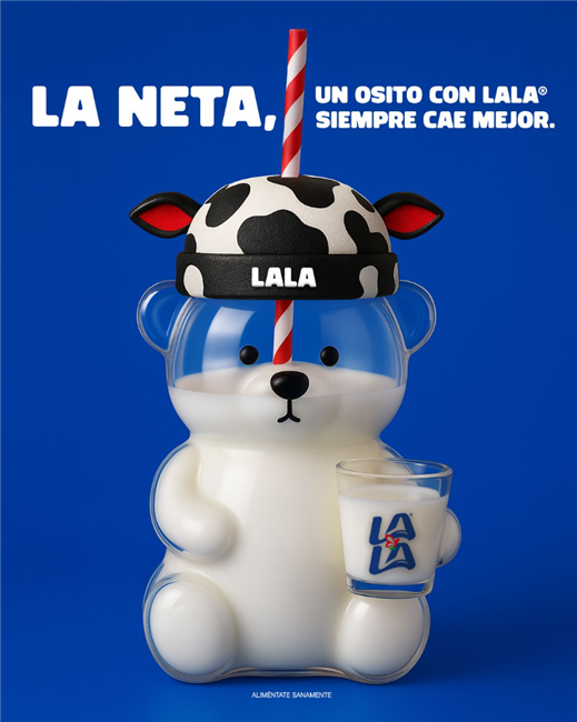 LALA apostó por un diseño que mantiene la ternura del icónico oso, pero adaptado a su estilo y colores distintivos de la marca, incluso con un gorrito de vaca que hace referencia a la leche.