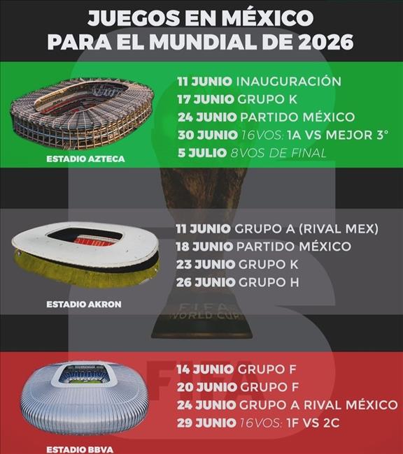 En la CDMX destacan dos partidos de la selección mexicana, entre ellos, la inauguración del Mundial 2026 el 11 de junio del próximo año. A su vez, el conjunto azteca cerrará su participación en la primera ronda también en esta sede.